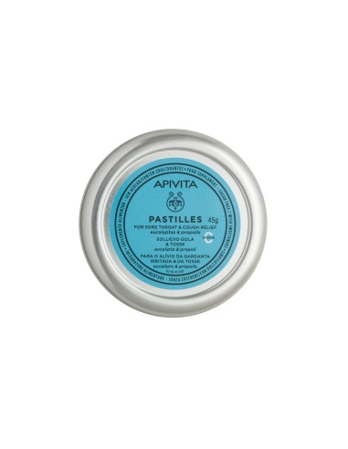 Apivita Pastilles for Sore Throat and Cough Relief Eucalyptus and Propolis es un complemento alimenticio para el alivio del dolor de garganta y la tos. Recomendado para niños a partir de 12 años. Compatible con homeopatía.