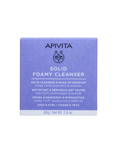 El Apivita Solid Foamy Cleanser es un agente limpiador sólido, sin jabón, ideal para limpiar delicadamente el rostro y los ojos. Su textura espumosa y cremosa elimina el maquillaje e impurezas sin deshidratar la piel, respetando el pH natural y protegiendo la zona sensible de los ojos. Es adecuado para el uso diario y para todo tipo de piel, especialmente para aquellas que buscan una limpieza suave, refrescante e hidratante.