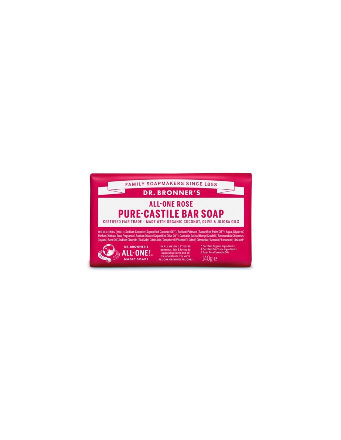 Dr. Bronners Biological Castile Soap es una barra de jabón, elaborado con aceites orgánicos certificados y de comercio justo. Formulado con glicerina, aceite de oliva y cáñamo, coco, rosa, jojoba y semillas de girasol.