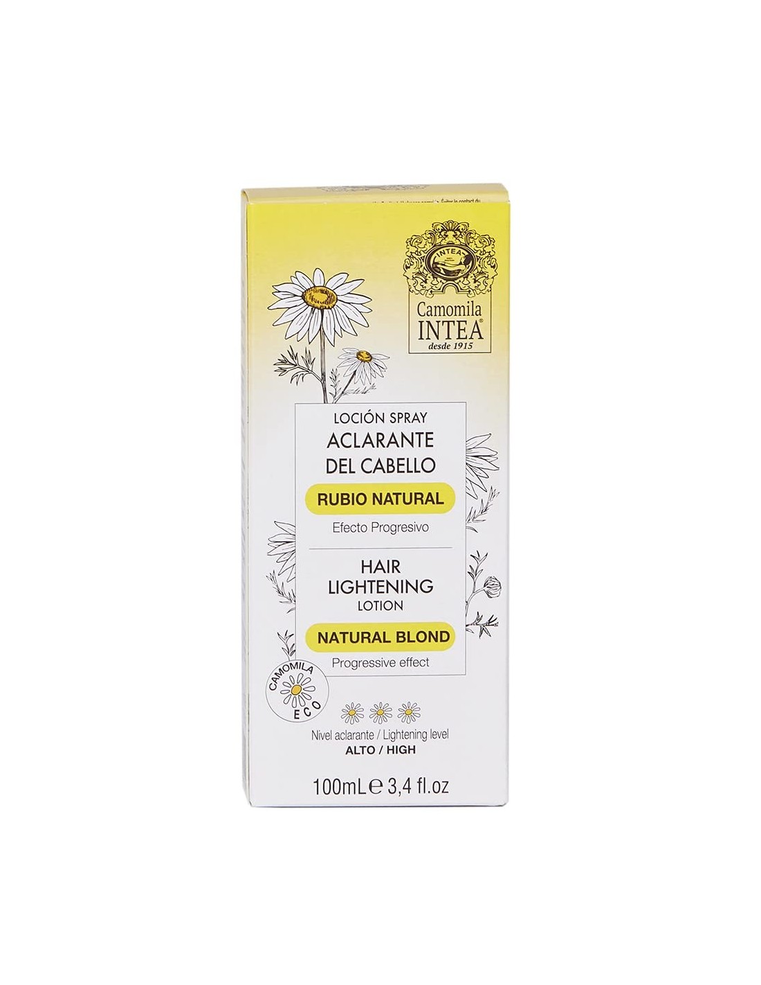 Intea Loción Manzanilla Rubio Natural es un producto de cuidado iluminador en spray ideal para cabellos rubios a castaños claros, ya sean naturales, con mechas o teñidos. Formulado con esencia y extracto de flor de manzanilla, aclara progresivamente el cabello de castaño oscuro a rubio natural. Es ideal para cabellos que antes eran rubios pero que se han oscurecido con el tiempo. Aplicado diariamente, ilumina el cabello y mantiene un color rubio más natural. Para cabellos rubios y castaños claros