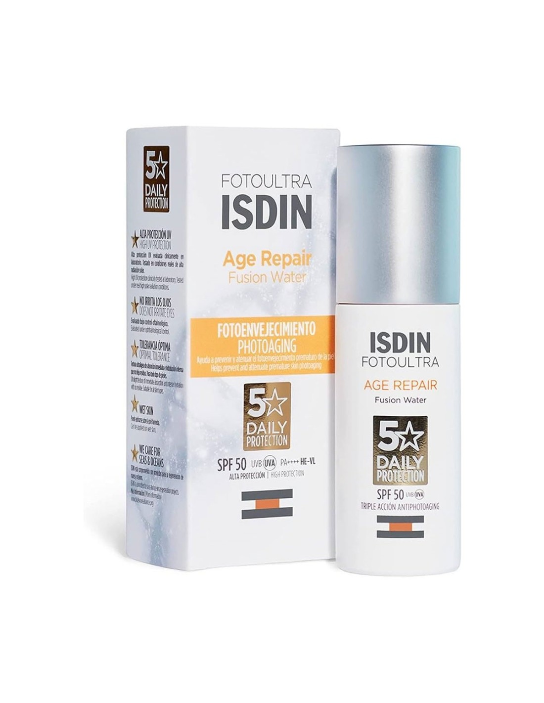 ISDIN FotoUltra Age Repair Fusion Water SPF50 es un producto de cuidado facial diario que asegura una alta protección frente a los rayos UVA y UVB del sol, a la vez que ayuda a prevenir y minimizar el fotoenvejecimiento prematuro de la piel. Hidrata intensamente. Adecuado para pieles atópicas y sensibles. Muy tolerable en todo tipo de pieles. Puede aplicarse sobre la piel húmeda. Testado dermatológica y oftalmológicamente.