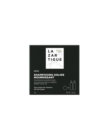 Lazartigue Nourishing Shampoo Bar tiene una textura de espuma untuosa fácil de aclarar. Fórmula biodegradable compuesta por 93 e ingredientes de origen natural. Enriquecido con Aceite de Dátil del Desierto, con propiedades hidratantes y nutritivas, respeta la fibra y el cuero cabelludo y permite preservar a largo plazo la salud y la belleza del cabello. Asocia un trío de activos de origen natural que hidrata, suaviza y aumenta su espuma.