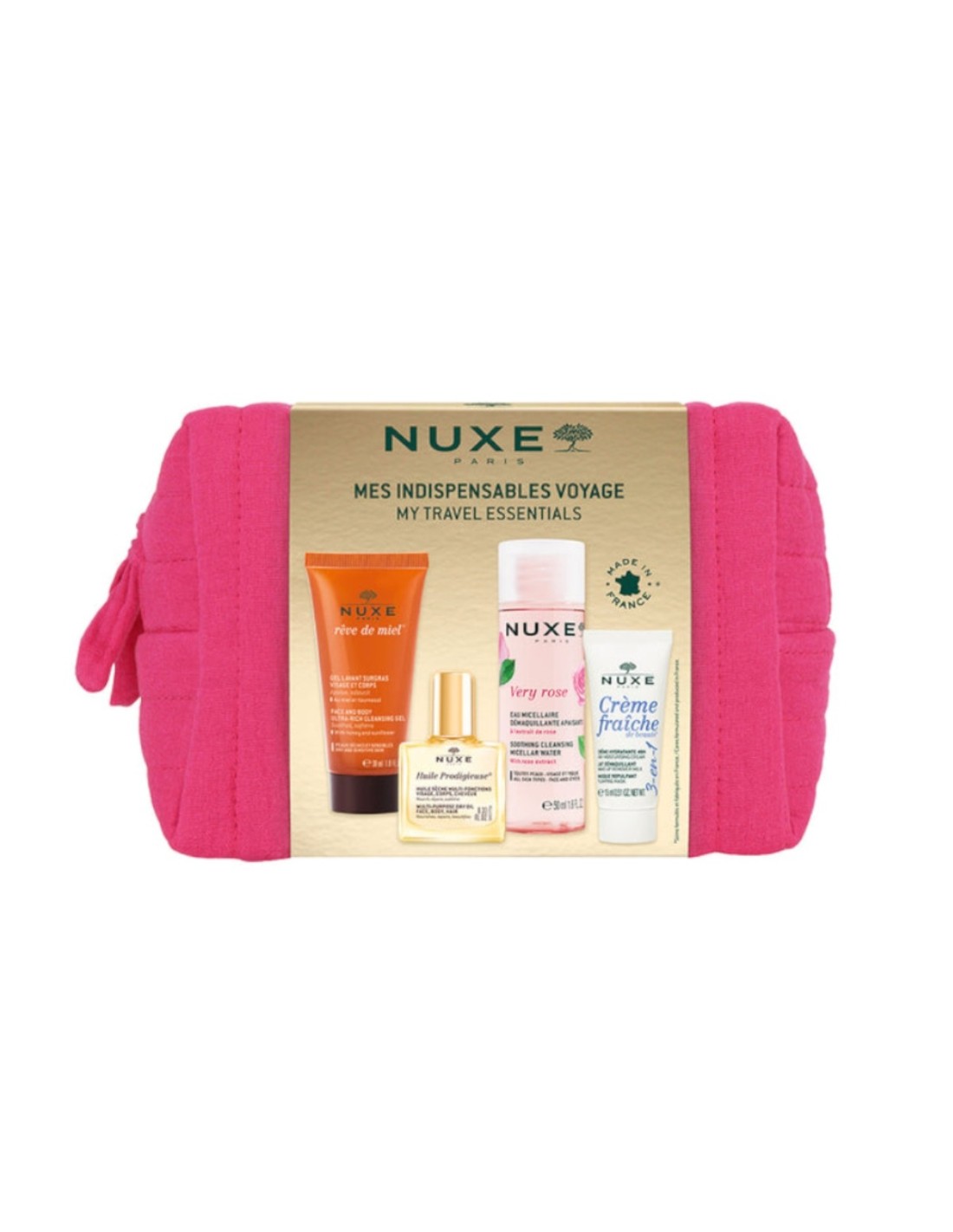 El Nuxe My Travel Essentials Kit Viagem es el conjunto ideal para mantener tu piel nutrida, hidratada y luminosa en cualquier destino. Pensado para aquellos que no renuncian a sus cuidados de belleza incluso lejos de casa, este kit compacto reúne los productos icónicos de la marca francesa Nuxe, reconocida mundialmente por su eficacia, sensorialidad y fórmulas con ingredientes de origen natural. Perfecto para viajes de corta o larga duración, este estuche elegante y práctico está compuesto por cuatro productos indispensables para el cuidado diario del rostro, cuerpo y cabello.