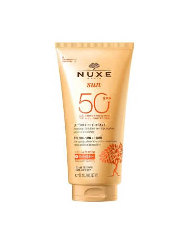 Nuxe Sun Leche Fundadora Alta Protección SPF50 es una leche de alta protección solar que ayuda a proteger la piel del rostro y del cuerpo de los rayos solares UVA y UVB, hidrata, previene el fotoenvejecimiento prematuro de la piel y la aparición de manchas.